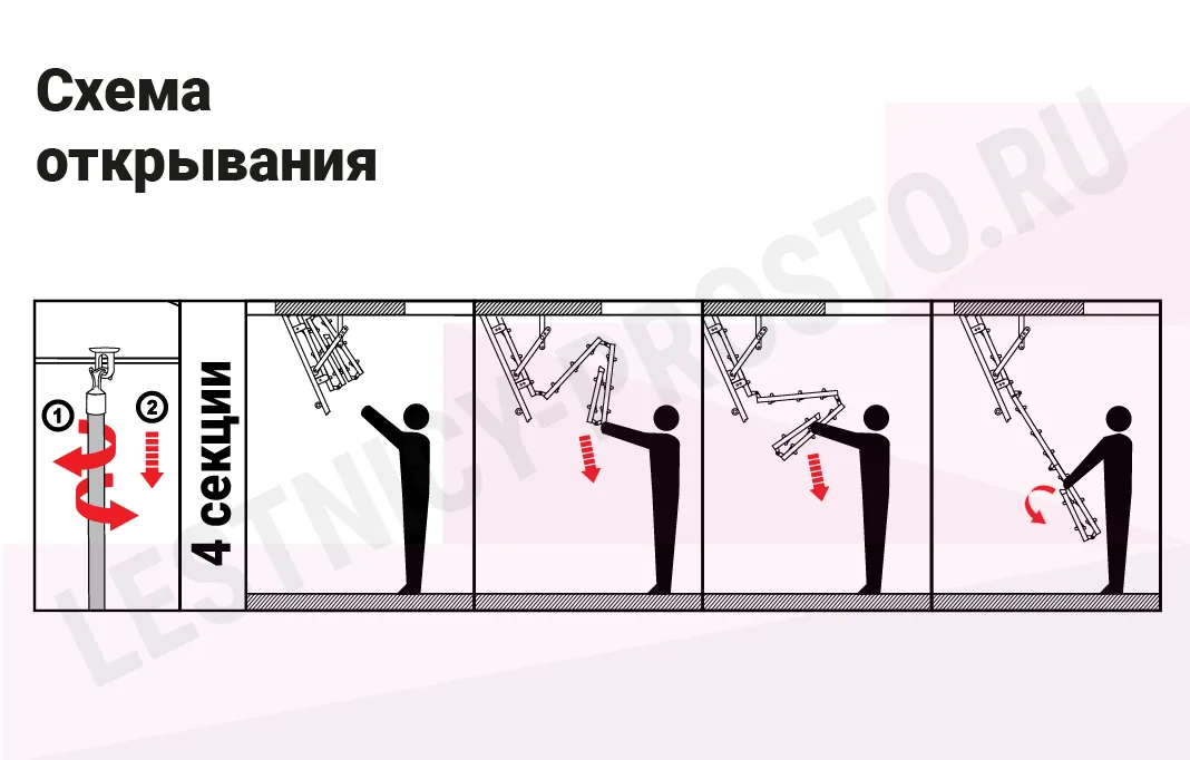 Складная 4-х секционная чердачная лестница. Ступени выполнены из сосны, имеют противоскользящие насечки, направляющие из металла