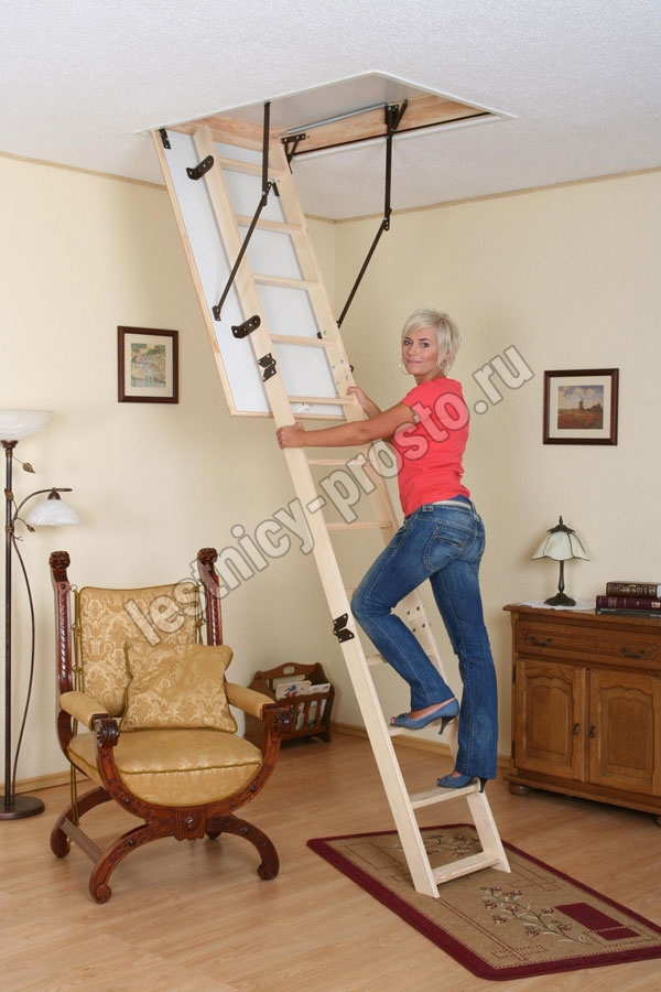 Лестница складная четырехсекционная, изготовлена из сосны. Термоизоляционная крышка типа "сэндвич" утеплена пенопластом, облицована с двух сторон ДСП белого цвета. Короб люка с уплотнителем. Все металлические элементы лестницы покрыты порошковой краской, ступени лестницы имеют антискользящие насечки и закреплены в столярное соединение «ласточкин хвост», что позволяет выдерживать нагрузку 150 кг. Деревянный стержень для открывания лестницы в комплекте.