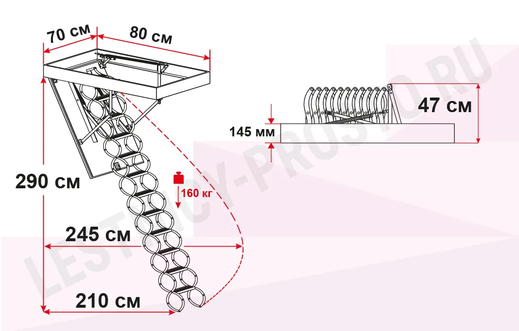 Все элементы лестницы выполнены из экологически чистых материалов и обработаны веществами, не содержащими тяжелых металлов. На ступенях антискользящие насечки. Короб лестницы изготовлен из металла. Термоизоляционная крышка типа "сэндвич" утеплена пенопластом, облицована с двух сторон ДСП белого цвета. Короб люка с уплотнителем. В комплекте деревянный стержень для открывания лестницы.