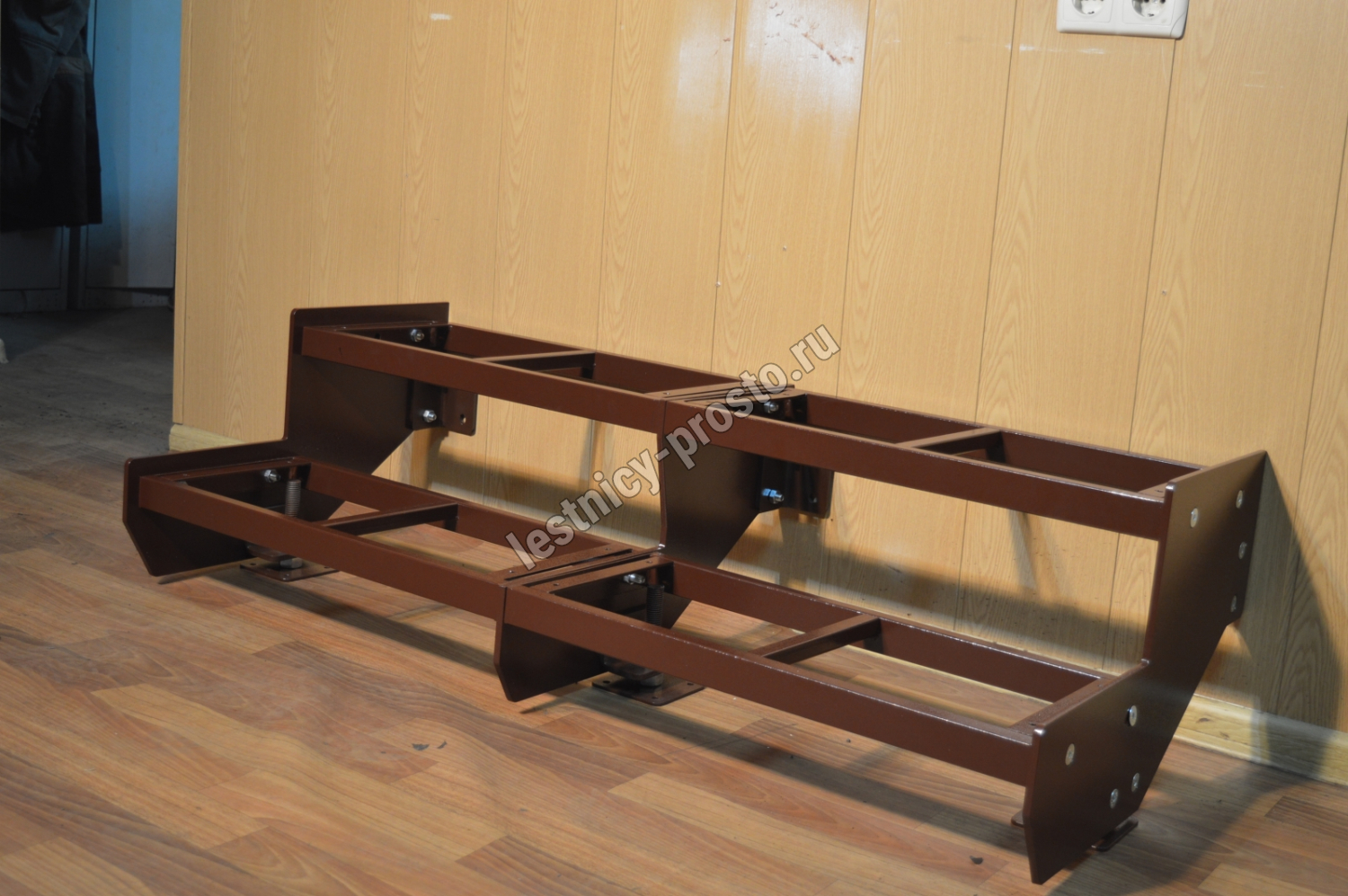 Покрытие порошковое, очень прочное и долговечное. Все детали каркаса крепятся с помощью болтов, благодаря чему Вы можете собрать каркас самостоятельно без применения сварки. В зависимости от ширины лестницы, каркас состоит из двух (ширина до 1 метра) или трех (ширина до 2 метров) опорных балок (тетив).