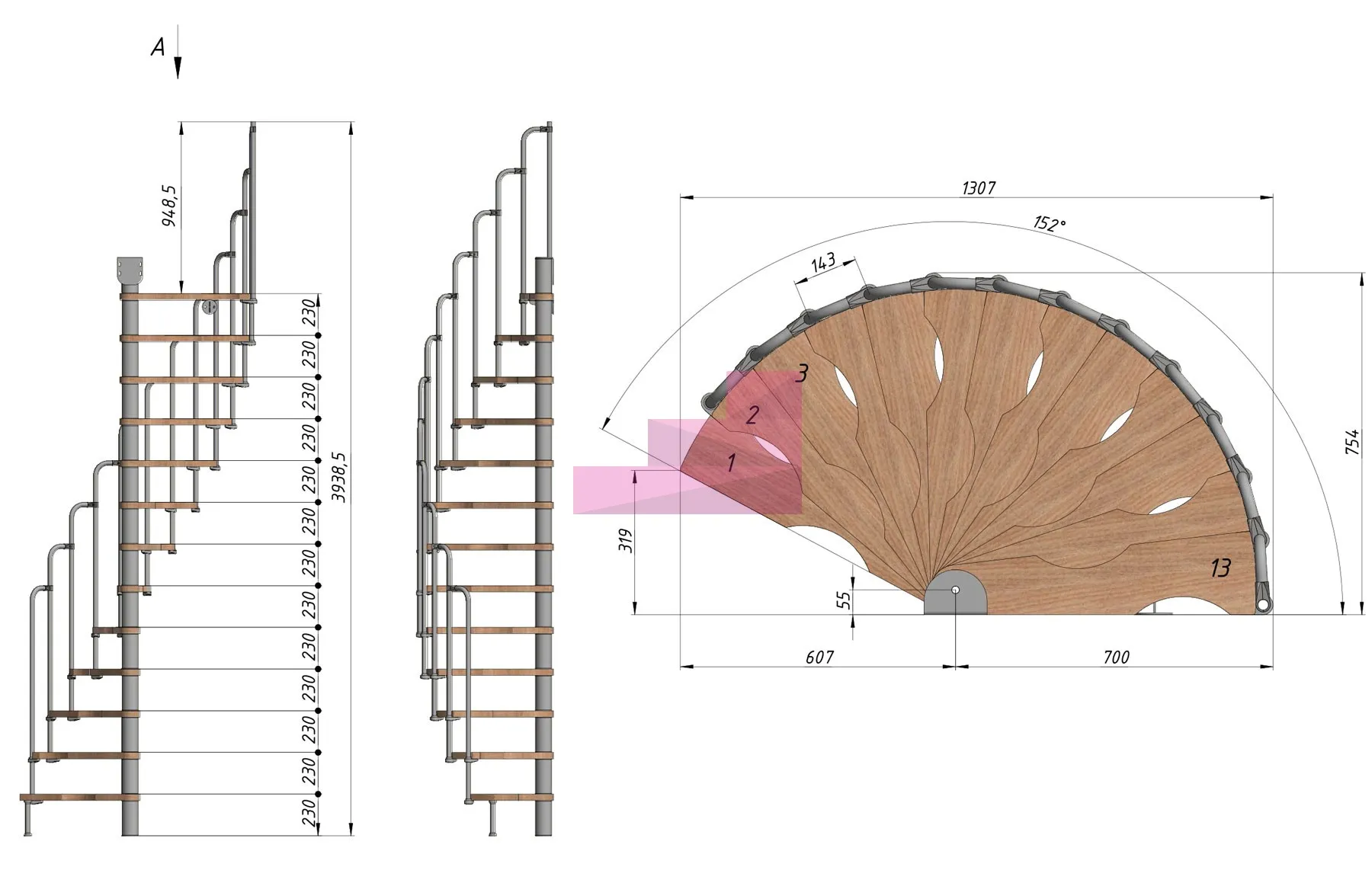 Высота лестницы 2990 - 3220 (13 ступеней) мм