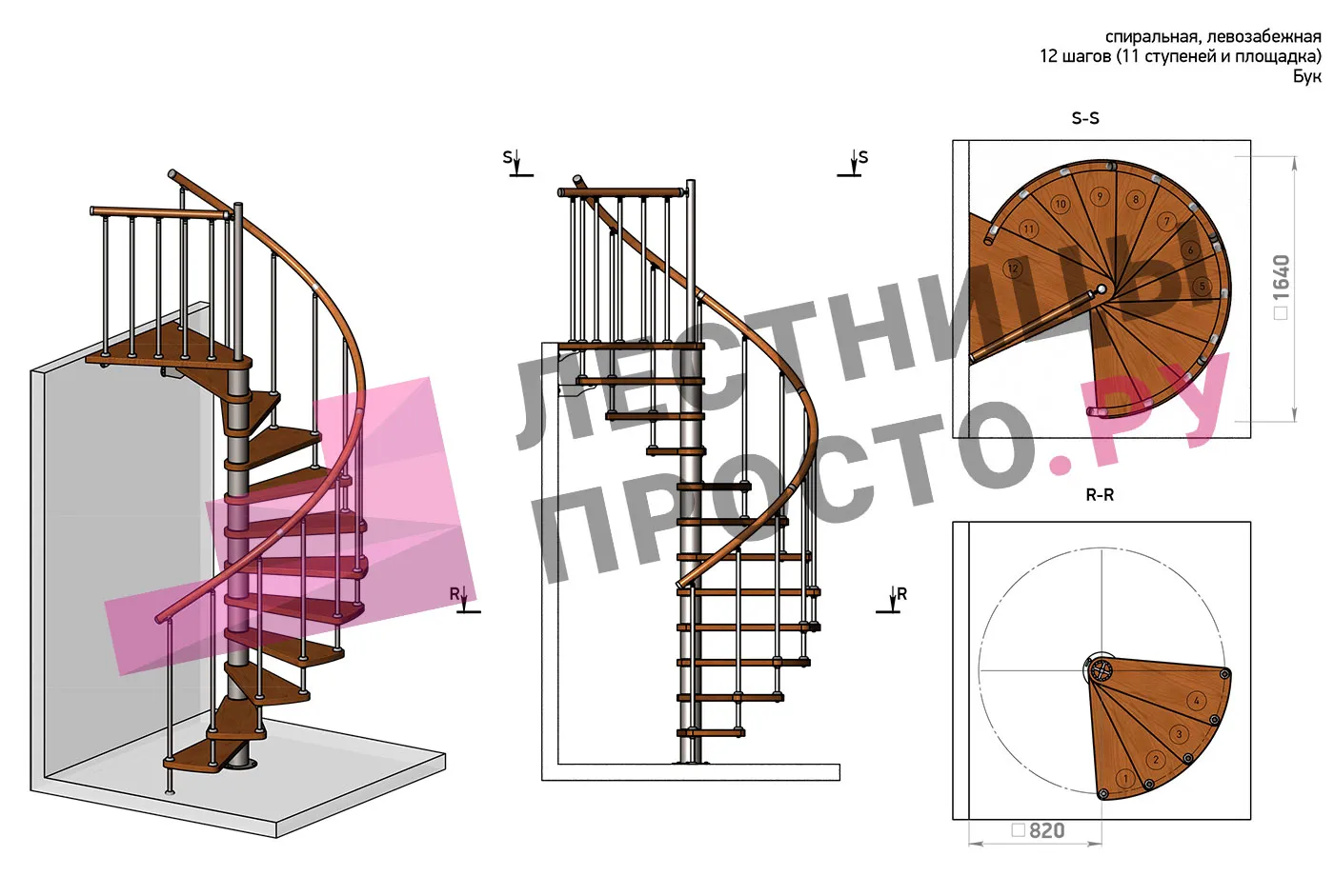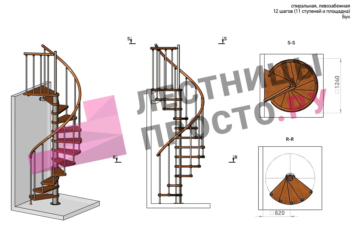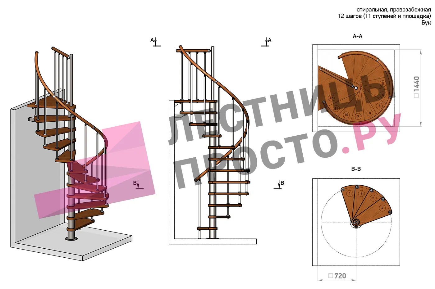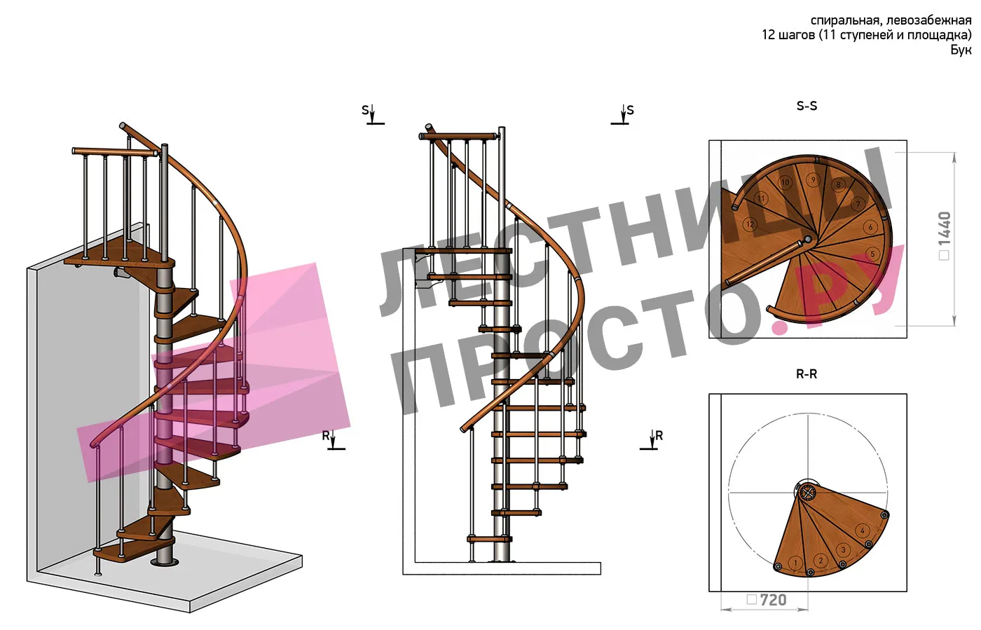 Правая, d=120см, 11 ступеней + площадка