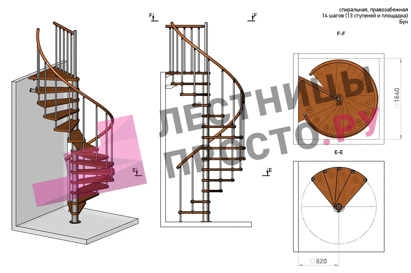 Правая, d=120см, 14 ступеней + площадка