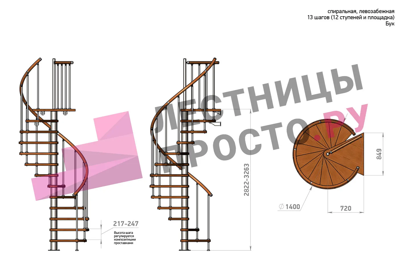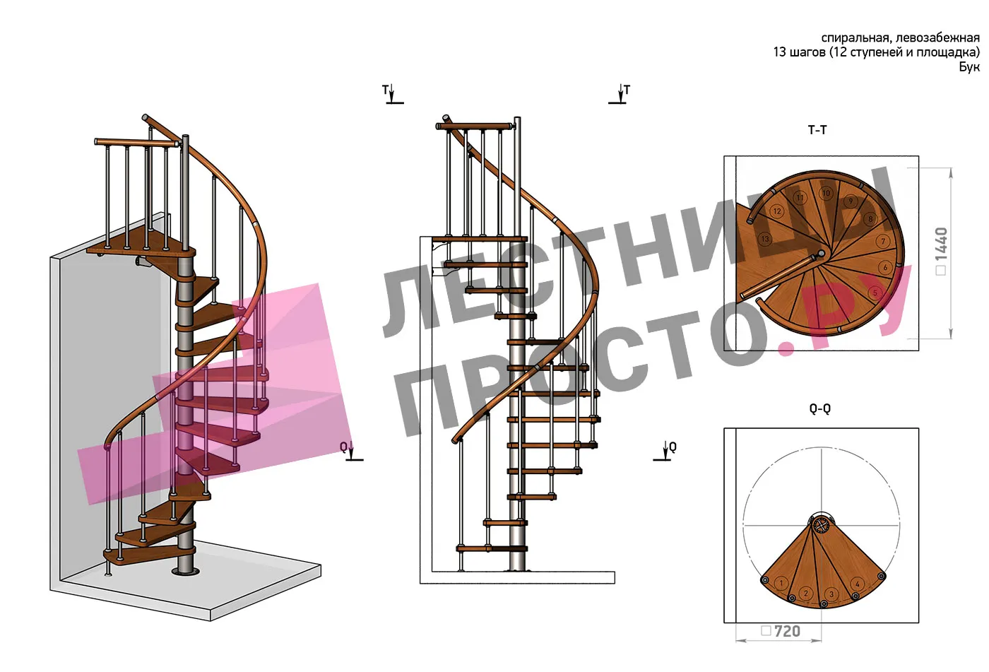 Левая, d=140см, 13 ступеней + площадка