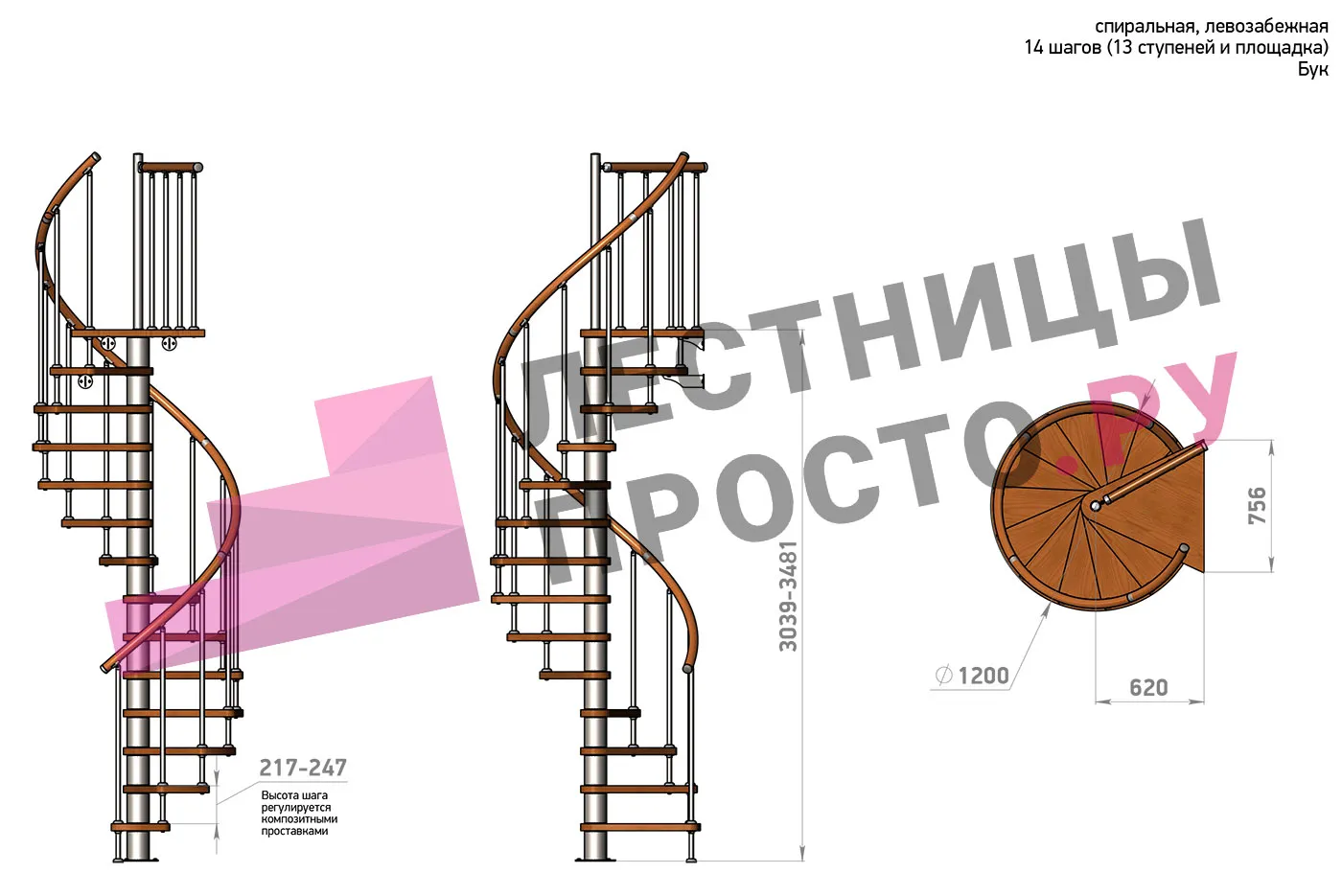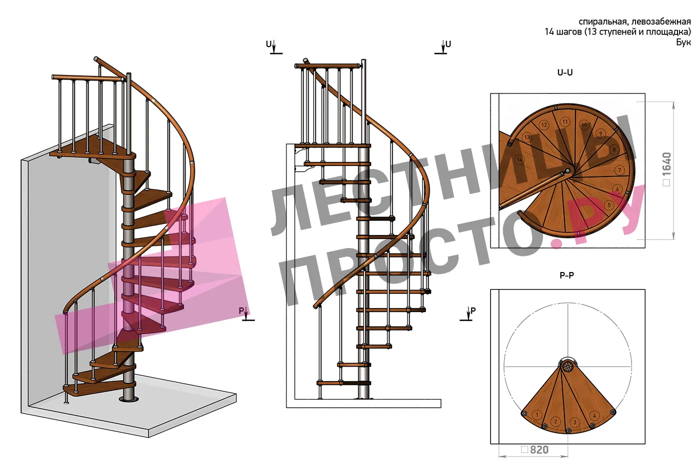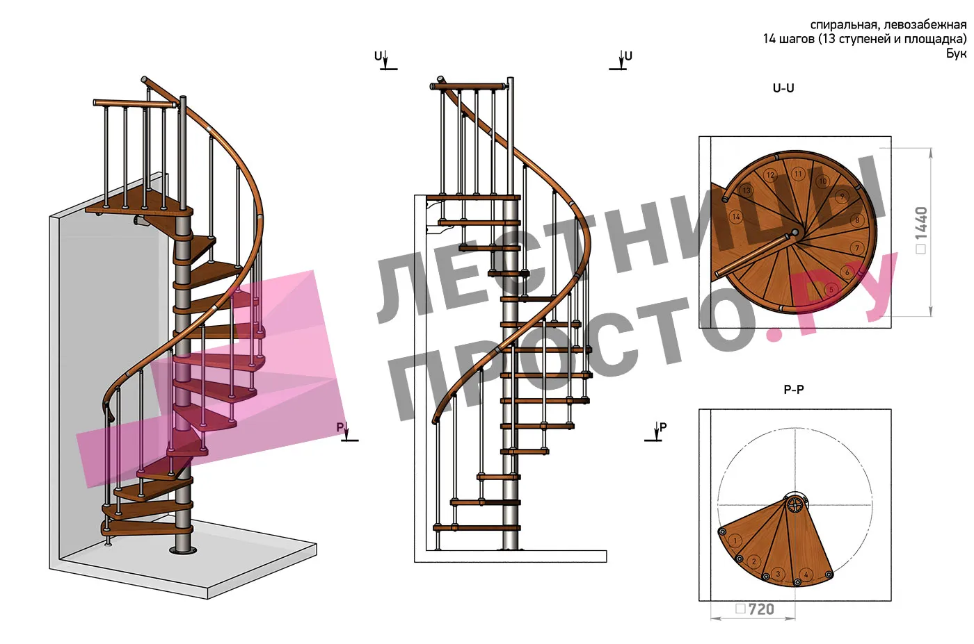 Левая, d=120см, 14 ступеней + площадка