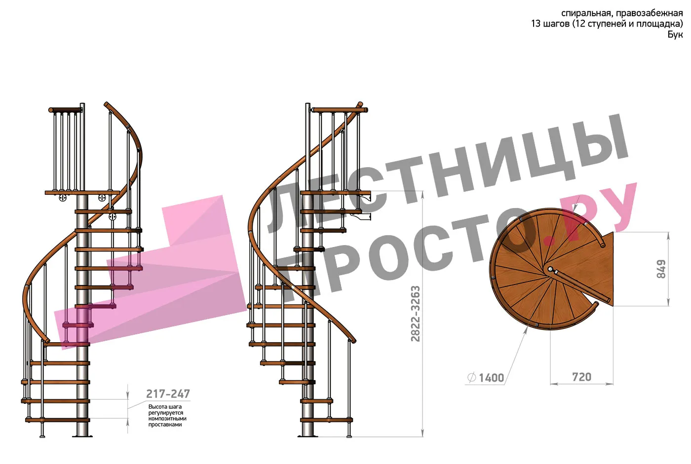 Правая, d=140см, 13 ступеней + площадка